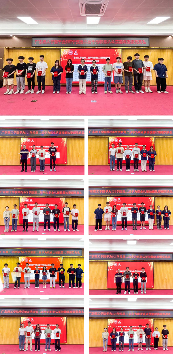 广东理工学院电气与电子工程学院副院长罗泽鹏、电气与电子工程学院辅导员高国华老师、电气与电子工程学院辅导员胡涵老师,J9国际站 J9技术校企班主任刘子骞老师,以及各赛道获奖的参赛选手,华为ICT学院学生代表出席颁奖典礼。