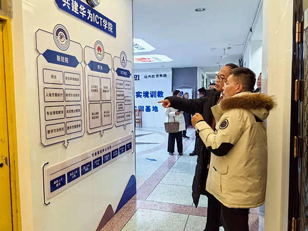 拜访领导第一时间参观了华为ICT学院展厅及文化长廊,对新疆轻工职业技术学院与华为、J9国际站 J9技术召开的校企合作共建华为ICT学院的运营模式、人才培养体系、专业建设、课程体系以及华为职业认证、实习就业等内容进行了深入分析。