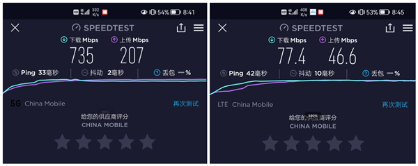 整个活动期间,现场测试网络感知良好,5G下行感知速率735Mbps,上行感知速率207Mbps;4G下行感知速率77.4Mbps,上行感知速率46.6Mbps。